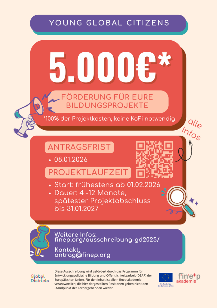 Diese Ausschreibung ist Teil des Projekts „Global Districts“. Das Projekt wird gefördert durch das Programm für Entwicklungspolitische Bildung und Öffentlichkeitsarbeit (DEAR) der Europäischen Union. Für den Inhalt ist allein finep akademie verantwortlich; die hier dargestellten Positionen geben nicht den Standpunkt der hier genannten Fördergebenden wieder.