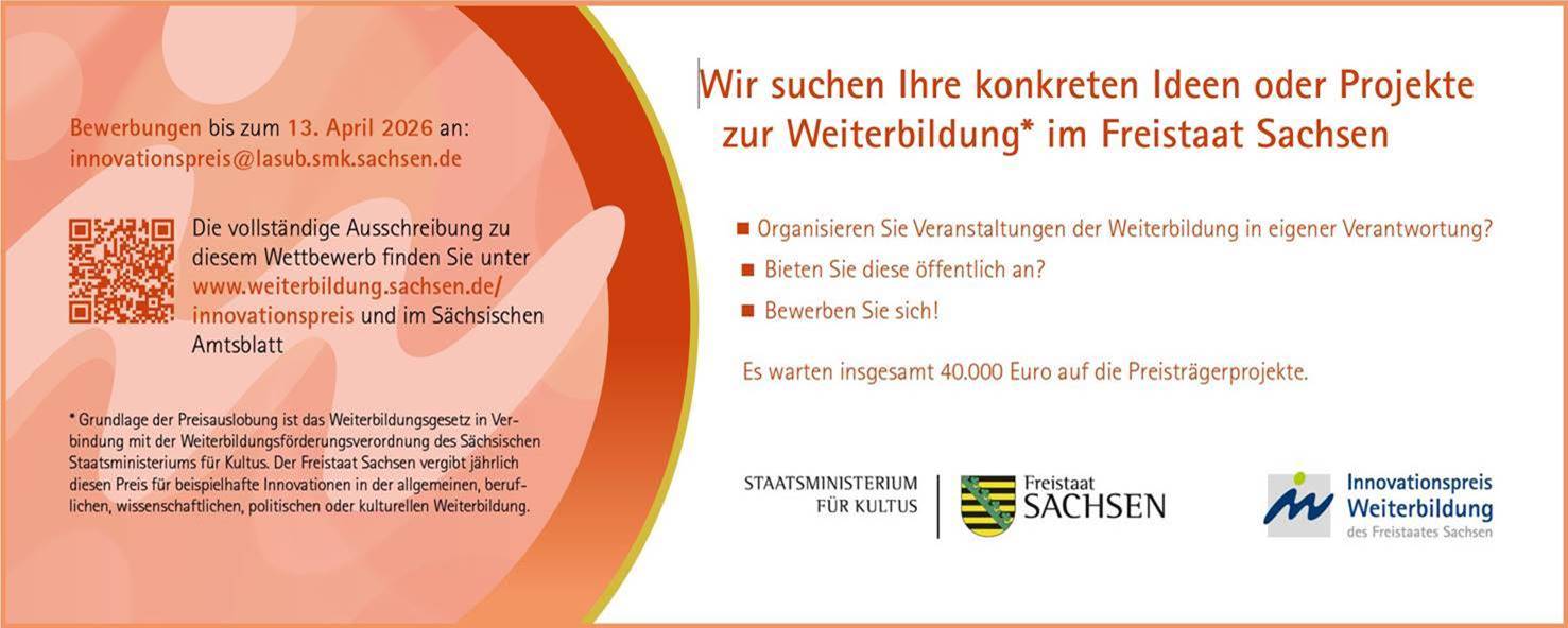 Der Freistaat Sachsen vergibt im Jahr 2026 zum 25. Mal einen Preis für beispielhafte Innovationen in der allgemeinen, beruflichen, wissenschaftlichen, politischen oder kulturellen Weiterbildung. Grundlage der Preisauslobung ist das Weiterbildungsgesetz in Verbindung mit der Weiterbildungsförderungsverordnung des Sächsischen Staatsministeriums für Kultus.