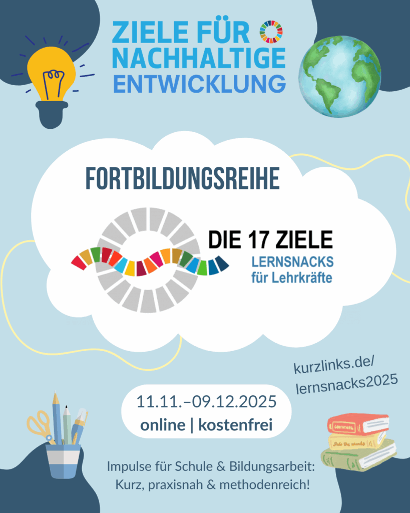 Vom 11. November bis 09. Dezember 2025 bietet ein Netzwerk von Nichtregierungsorganisationen, die sich in der entwicklungspolitischen Bildungsarbeit und für das Globale Lernen engagieren, erneut die digitale Fortbildungsreihe „Die 17 Nachhaltigkeitsziele – Lernsnacks für Lehrkräfte“ an. Sie richtet sich an Lehrkräfte aller Schulformen und Jahrgangsstufen, außerschulische Bildungsakteur*innen und weitere Interessierte.
