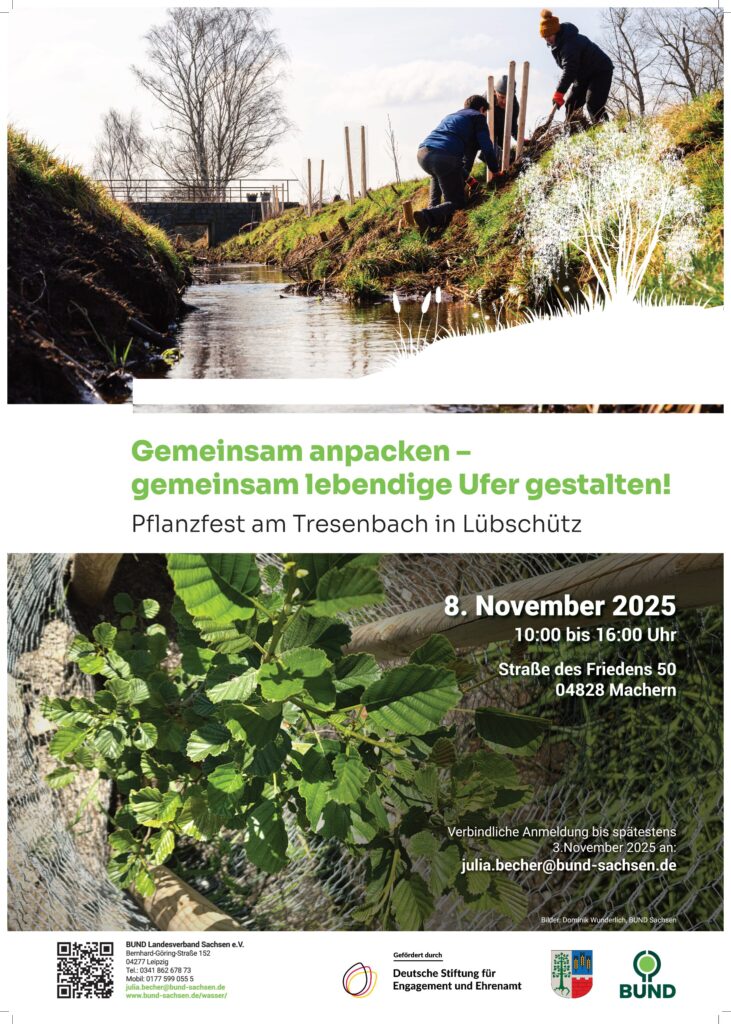 Zusammen mit der der Gemeinde Machern lädt der BUND Sachsen zu einem großen Pflanzfest am Tresenbach im Ortsteil Lübschütz ein. Gemeinsam wollen wir das Gewässer mit der Pflanzung von heimischen Bäumen und Büschen naturnah gestalten und so ein ökologisch wertvolles und erlebbares Gewässer schaffen. Eine Beschattung hat viele Vorteile für den Bach – Verkrautung und Verschlammung können verhindert und der Pflegeaufwand in der Unterhaltung somit reduziert werden. Außerdem freuen sich auch die Tiere und Pflanzen im Bach über angenehm kühle Temperaturen im Sommer!