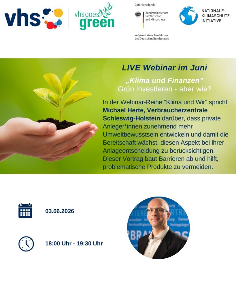 In der Webinar-Reihe „Klima und Wir“ spricht Michael Herte, Verbraucherzentrale Schleswig-Holstein, darüber, dass private Anleger*innen zunehmend mehr Umweltbewusstsein entwickeln und damit die Bereitschaft wächst, diesen Aspekt bei ihrere Anlageentscheidung zu berücksichtigen. Dieser Vortrag baut Barrieren ab und hilft, problematische Produkte zu vermeiden.